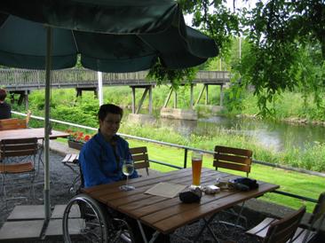 Einkehrmöglichkeiten: Gibt’s entlang der Strecke reichlich (Wahlscheid, Donrath). Erwähnt sei der Biergarten Aggerschlösschen (geöffnet unter der Woche ab 17:00 bei gutem Wetter, am Wochenende auch tagsüber). Zugang zum Biergarten barrierefrei, die Toiletten sind aber mit Rolli nicht befahrbar)