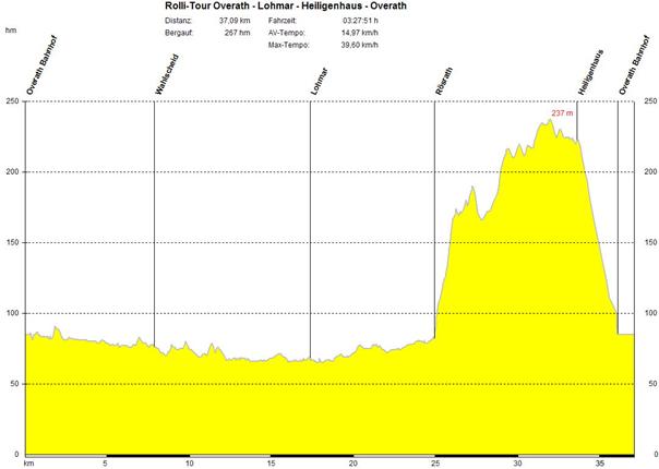 Topographie: Bis Lohmar relativ flach, mit kleineren Steigungen zwischen Wahlscheid und Lohmar (eine steile 5 m lange Rampe an einer schmalen Aggerbrücke vor Donrath). Zwischen Rösrath und Overath teils heftige und lange Steigungen
