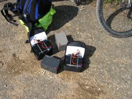 Um sicherzustellen, daß die 34 kg Zuladung nicht überschritten werden, haben wir jedes Ausrüstungsteil während der Vorbereitung gewogen und eine entsprechende Liste erstellt. Die endgültige Liste ergab dann ca. 30,5 kg (ohne Anhänger), wobei die mitgeführten Reserve-Akkus für das Handbike alleine fast 17 kg ausmachten.