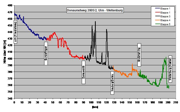 Topographie: Meist eben bis leicht abschüssig, am 3. und 5. Tag ein paar Anstiege mit mäßiger Steigung. Entlang der Donau einige kurze, aber steile Anstiege auf den Damm