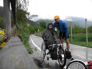 Endlich ist die kalte Jahreszeit vorbei und wir konnten uns wieder sportlich betätigen. Nach einigen kürzeren Ausflügen im Kölner Raum haben wir uns am 17.5.2008 zu unserer ersten Mehrtagestour 2008 aufgemacht. Zum ersten Mal sollte es ins Ausland gehen. Dazu hatten wir uns den Etschtalradweg von Burgeis nach Salurn ausgesucht. Ich war diesen relativ neu angelegten Radweg teilweise schon letztes Jahr im Rahmen einer Transalp gefahren und hatte damals schon den Entschluss gefasst, dass dieser Radweg, obwohl mitten in den Alpen, ideal für Handbiker wäre.