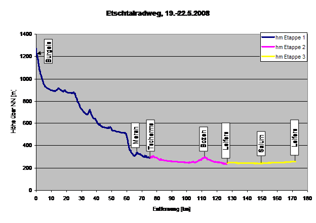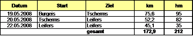 Erste Etappe, 19.5.2008, von Burgeis nach Tscherms, 75,6 km, 95 hm