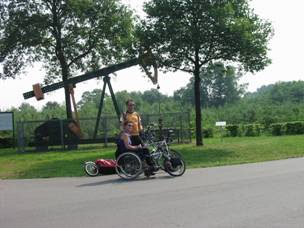 Weiter ging’s nach Bokeloh, wo es endlich was zu Trinken gab. Die letzten 7 km bis nach Meppen gingen dann recht flott von der Hand und das Hotel war dank GPS schnell gefunden. Auch heute hatten wir die gesamte Strecke mit nur einem Akku-Satz geschafft. Rekord für uns, der „dicke“ Akku-Satz von Stricker ist wirklich eine tolle Sache. Schnell noch die Räder versorgt, und nach dem Einchecken rasch unter die Dusche. Auch hier war das Zimmer nicht 100%ig rolligerecht, aber wir sind zurechtgekommen. Das Badezimmer war recht groß und so war genügend Platz zum Ragnieren mit dem Rolli vorhanden. Die Toilette war erhöht und mit einem Haltegriff ausgestattet, der jedoch so angebracht war, dass es beim besten Willen für seinen eigentlichen Zweck nicht zu gebrauchen war. Die Duschetasse war Standard, ein Dusch-Hocker ohne Lehne war auch vorhanden. Das Hotel hatte einen allerdings recht kleinen Aufzug, Viel breiter als 40 cm Sitzbreite passt da nicht rein, und das Hotel war mit dem Rolli nur über den Nachteingang über eine sehr steile Rampe zu betreten.