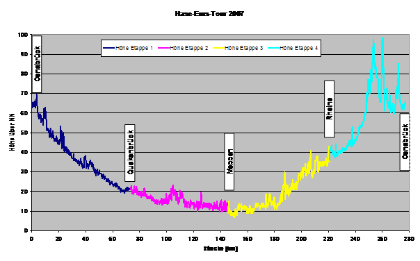 Topographie: Die ersten drei Tage meist flach, nur über die Flussbrücken sind ein paar Höhenmeter zu bezwingen. Der vierte Tag von Rheine nach Osnabrück hat ein paar Höhenmeter mehr, die aber nicht besonders steil sind