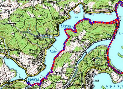 entlang, vorbei an der alten Listertalsperrmauer, welche 1912, lange bevor der