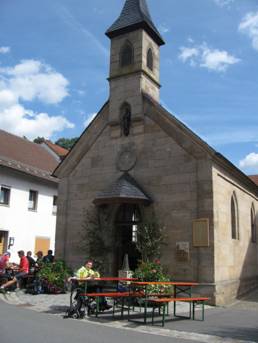 kleine Kapelle mit ein paar Bierbänken, die von dem Dorfgasthof mit fester und