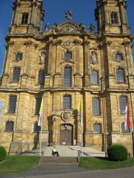 Weiter ging's vorbei an Obstwiesen mit vollhängenden Zwetschgen- und Mirabellenbäumen nach Lichtenfels. Dort kamen wir recht früh an, so früh, dass unser Hotel noch geschlossen war. Wir streiften deshalb noch etwas durch die Stadt und vertrieben uns so die Zeit, bis um 16:00 Uhr das Personal im City Hotel direkt am Bahnhof eintraf, wo Britta ein Zimmer gebucht hatte. Schnell hatten wir eingecheckt und das Zimmer, das leider nur über einige Treppen zu erreichen war, bezogen. Wir wollten heute noch losziehen um die Wallfahrtskirche Vierzehnheiligen zu besuchen. Diese liegt ein paar Kilometer außerhalb und vor allem ein paar Höhenmeter oberhalb von Lichtenfels. Wir haben deshalb den kleinen, bisher unbenutzten Akkusatz ans Handbike geschnallt und los ging's. Zunächst fuhren wir flach durch Lichtenfels. Rechts des Mains kann man schon von weitem Kloster Banz sehen, am Horizont ist der Staffelstein zu sehen und links erhebt sich Vierzehnheiligen. Zusammen werden diese drei das Fränkische Dreigestirn genannt.