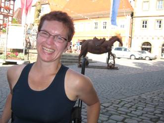 In Würzburg war umsteigen angesagt. Laut Fahrplan hatten wir dafür 10 Minuten Zeit. Nicht wirklich viel, zumal ich mich neben meinem Fahrrad auch um den bleischweren Anhänger und Brittas Handbike zu kümmern hatte. Zudem hatten wir auch noch ein paar Minuten Verspätung. Zum Glück hat sich der Umsteige-Service der Bahn wie geplant um Britta gekümmert. Britta wurde dann auch etwas nervös, weil ich doch etwas länger als geplant gebraucht habe, den ganzen Krempel über den Bahnsteig zu schleppen, während Britta schon im Zug saß. Der Kommentar des Schaffners "dann fahren wir wohl ohne Ihren Mann" konnte sie auch nicht entscheidend beruhigen, zumal das Fahrradabteil schon recht gut gefüllt war. Mit etwas Hektik hat es aber dann doch noch geklappt und wir sind gut in Bayreuth angekommen. Aussteigen war recht entspannt, weil Bayreuth Endstation war.