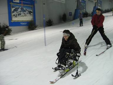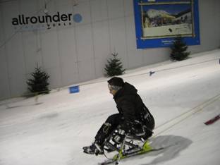 Fündig geworden sind wir über den Behinderten Sportverband Nordrhein Westfalen, der solche Kurse in der Skihalle Neuss anbietet. Nach ein paar Wochen Wartezeit ging’s dann an einem Samstag im März 2007 los. Glücklicherweise ist Neuss nicht sehr weit entfernt von unserem Wohnort, und so haben wir uns in die Skiklamotten geschmissen und sind los gedüst.