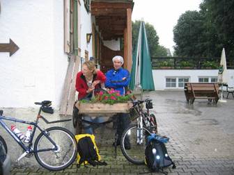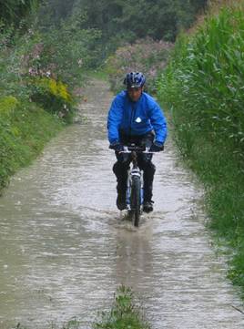 Die mühsam getrockneten Klamotten hielten ca. 2 km dicht. Auf dem Inntal-Radweg kam uns ein Radler entgegen und meinte, der Radweg wäre überschwemmt und unpassierbar. Mann oder Memme, war jetzt die Frage. Weil keiner Memme sein wollte, haben wir uns also durch die Fluten gestrampelt. Achsen und Tretlager wurden so mal wieder so richtig durchgewaschen. Die vorhergegangen Trocknungsversuche unserer Latschen wurden allerdings so recht schnell zunichte gemacht.