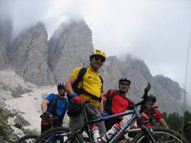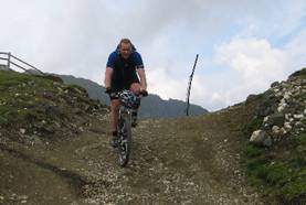 Nach ausgiebigem Frühstück ging’s zunächst auf nicht besonders stark befahrener Straße nach Longiaru. Ab hier beginnt die Auffahrt zum Kreuzkofel-Joch. Wir haben hier wohl den Fehler gemacht, nicht dem Wirtschaftsweg zu folgen, sonder auf dem Wanderweg den kürzesten Weg zum Joch zu suchen. Dies bedeutete ca. 2 Stunden schieben und tragen. Der eine oder andere unserer Rookies hat sich hier wohl die Frage nach dem Sinn des Bikes in den Alpen gestellt. Erfahrene Transalpler sind hier wohl eher in der Lage, diese Frage in den Hintergrund zu drängen. Sei’s drum, wir sind alle oben angekommen und genossen nach kurzer Abfahrt ein heißes Süppchen in der Schlüterhütte. Von dort ging’s zunächst auf steilem Forstweg bergab. Wir haben uns dafür entschieden, auf einen nahezu höhengleichen Wanderweg Richtung Borgles-Alm zu fahren. Zwar war auch dieser zu ca. 50% nicht fahrbar, entschädigte aber durch landschaftliche Reize für die Mühe. Noch ein kurzer Anstieg zu Borgles-Alm und eine rasante Abfahrt nach St. Ulrich, und schon war eine weitere Etappe geschafft. Die Suche einer passenden Unterkunft gestaltete sich hier allerdings etwas schwieriger, aber nach einem Weisbier und einigen Telefonaten hatten wir eine private und zudem recht billige Unterkunft gefunden. Wir checkten ein, duschten und befreiten die Klamotten vom gröbsten Gestank und machten uns dann auf, die gesparte Kohle für die Übernachtung in Kalorien und Promille umzusetzen. Nach vorzüglichem Mahl ging’s dann voll gefressen zur Nachtruhe.