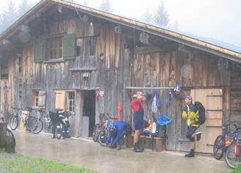 Nachdem die Räder zusammengebaut und die Autos in der Tiefgarage geparkt waren, ging es dann um 08:30 bei kühlen 13°C und leichtem Nieselregen endlich los, zunächst gemächlich auf Straße ansteigend entlang der Breitach nach Rohrmoos. Dort beginnt eine Mautstraße, die nach Sibratsgfäll über die Grenze nach Österreich führt. Der Asphalt endet kurz nach Sibratsgfäll und eine Schotterpiste führt Richtung Stogger Sattel. Die Abfahrt nach Au ist recht unspektakulär, allerdings regnete es mittlerweile immer heftiger und das Thermometer zeigte mittlerweile schattige 11°C an. Egal, wir machen das alles ja nicht zum Spaß, und so ging’s weiter auf Schotterpiste Richtung Furka. An der eigentlich nicht bewirtschafteten Vorderen Kriegsbödenalpe haben wir uns vor dem mittlerweile heftigen Regen untergestellt und dabei wohl einen ziemlichen Radau veranstaltet. Jedenfalls hat uns eine freundliche ältere Dame gehört und uns aus lauter Mitleid einen heißen Tee gekocht. Trotzdem mussten wir natürlich weiter. Gonso hatte mittlerweile festgestellt, daß die neuen Goresocken wasserdicht waren und das eingedrungene Regenwasser perfekt davon abhielten, wieder ins Freie zu entweichen. Der Furka-Übergang auf ca. 1600 m war dann recht schnell erreicht. Mittlerweile hat der Regen etwas nachgelassen und auf der Abfahrt nach Fontanella (zunächst Schotter, dann Asphalt) linste sogar ab und zu die Sonne hervor. Weiter ging’s dann auf Asphalt über Sonntag, Blons und Thüringen nach Nenzing, wo wir gegen 17:00 nach ca. 8:20 Stunden Fahrzeit eintrafen. Im Voraus hatten wir schon 5 Betten im Gasthaus Rössle reserviert. Da wir zu faul waren, das Gasthaus noch mal zu verlassen, aßen wir hier auch zu Abend, nachdem wir Wäsche gewaschen hatten. Die Fahrräder sollte eigentlich der Chef des Hauses wegschließen. Das hat er wohl vergessen, und so standen unsere Bikes über Nacht unverschlossen vor dem Haus…
