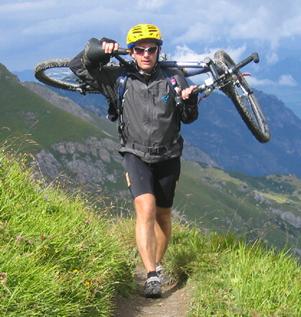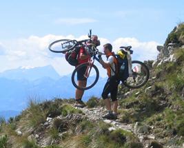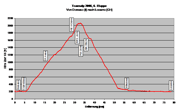 Im Rifugio S. Jorio, wo Heidi höchstpersönlich, aber relativ schleppend bediente, stärkten wir uns noch mal für die bevorstehende Schiebepassage auf einem tollen Kammweg mit faszinierender Aussicht auf den Lago Maggiore. In den von Zahn angegebenen 20 Minuten ist diese Schiebepassage allerdings nicht zu schaffen. Wir sind sehr zügig gegangen und haben etwa eine Stunde dafür gebraucht. Danach folgte eine tolle Abfahrt auf Schotter, später auf Asphalt bis nach Bellinzona. Den letzten Gegenanstieg von ca. 150 hm haben wir uns gespart und sind direkt in Tal geschossen. Auf dem recht gut beschilderten Radweg ging’s dann bis nach Locarno, wo wir uns in einer Kneipe zur Feier der gelungenen Alpenüberquerung das eine oder andere Bierchen gönnten.