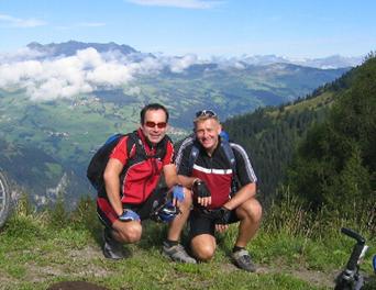 Weiter ging’s zum Mattler Joch, zunächst auf Piste und die letzten paar Höhenmeter per pedes. Die Abfahrt nach Steg ist recht einfach und verläuft zunächst auf Schotter, dann auf Asphalt. In Steg angekommen, hielten wir erst mal Kriegsrat, da Jürgen die vergangene Nacht auf der Schüssel noch in den Knochen steckte. Er beschloss deshalb, auf der Straße hinunter ins Rheintal zu fahren und auf dem Radweg nach Maienfeld zu düsen.