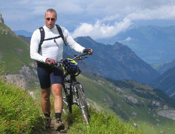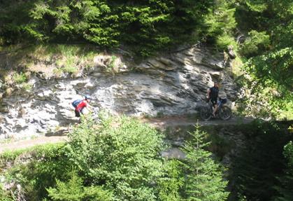 Seppl’s Knieschmerzen wurden leider immer schlimmer. Nach der Abfahrt auf Asphalt nach Tamins entschloss er sich, in Thusis einen Arzt aufzusuchen und mit dem Postbus nach Obermutten zu fahren. Wir trennten uns deshalb in Realta, wo wir von der Straße abbogen, um über Scharans auf den Alten Schin Pfad zu gelangen. Der Alte Schin Pfad ist ein Highlight der Tour. Er führt durch dunkle Galerien und ist über weite Strecken in eine steile Felswand gehauen. Das Wetter meinte es heute auch gut mit uns, und so genossen wir die Strecke sehr. Leider liegt Obermutten auf der anderen Seite des Albula-Tales. Deshalb mussten wir 350 Höhenmeter auf einer schmalen Asphaltstraße bergab brettern. Unten angekommen gönnten wir uns in einer Kneipe noch eine Erfrischung und füllten unsere Wasserflaschen auf. Nach einem kurzen Blick in die beeindruckende Albula-Schlucht mussten wir ca. zwei Kilometer auf einer viel befahrenen Bundesstraße zum Abzweig nach Obermutten fahren. Auf der Bundesstraße ist auch ein langer Tunnel zu durchfahren. Es gibt dort allerdings einen recht schmalen Radweg. Direkt nach dem Tunnel geht’s dann auf die schmale, nicht asphaltierte Straße über Mutten nach Obermutten. Zahn behauptet, es wären 39 Kehren. Wir haben nicht nachgezählt, aber es waren recht viele. Auch nicht nachgezählt haben wir die Millionen lästiger Fliegen, die, angelockt durch die mittlerweile enorme Dunstglocke um unsere Rucksäcke, einen Lift nach oben suchten. Etliche mussten dieses Ansinnen mit dem Leben bezahlen. In Mutten überholte uns der kleine Postbus, in welchem Seppl saß. Seine Mission war offensichtlich erfolgreich und so trafen wir uns im Gasthaus Post in Obermutten ca. 30 Minuten später nach ca. 9:20 Stunden Fahrzeit. Seppl berichtete von sagenhaft hübschen Arzthelferinnen und so gab es spontan weitere Bewerber für eine Patella-Sehnen-Entzündung. Neben dem an sich schon schmerzlindernden Anblick der Amazonen verabreichte man Seppl dort noch zwei Spritzen.