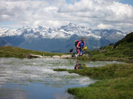 19.7.09, Sterzing – Lana, 79,6 km, 1157 hm auf, 1778 hm ab, 7:41 min Erleichterung beim Blick aus dem Fenster… Sonne! Trotzdem waren die höheren Lagen noch eine Winterlandschaft. Wir beschlossen deshalb für heute anstatt über die Schneebergscharte zu gehen eine geruhsame Etappe bis Lana einzulegen. Schon beim Anziehen zum Frühstück merkte ich, dass meine neue und sündteure Radhose nicht kompatibel mit meinen wund gescheuerten Hautstellen war, trotz Sprühpflaster und Wundsalbe. Die einzige Möglichkeit zur Weiterfahrt bot meine topmodische Boxershorts (mit Eingriff), die ich als nächtliches Beinkleid bei einem namhaften Kaffeeröster erstanden hatte. Das sah zwar ziemlich dämlich aus, aber so konnte ich bei entsprechender O-Bein-Stellung relativ schmerzfrei gehen und strampeln.