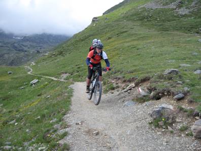 18.7.09, Lanersbach – Sterzing, 48 km, 1171 hm auf, 1802 hm ab, 7:02 min Der erste Blick aus dem Fenster zeigte, dass die Wetterfrösche sich ausnahmsweise mal nicht geirrt hatten. Dicke Schneeflocken fielen vom Himmel. Noch blieb hier im Tal nichts liegen, aber je weiter der Blick bergwärts wanderte, umso weißer wurde die Landschaft. Ratlose Diskussionen beim Frühstück, immerhin sollte es auf gut 2300 m übers Tuxer Joch gehen. Ein Anruf bei der Tuxer Joch Hütte sollte Aufschluss über die Wegbeschaffenheit geben. 5 cm matschiger Neuschnee, so die Auskunft der Hüttenwirtin. Kein Problem für uns, dachten wir. Mit leichtem Rucksack (alles, was warm hält, hatten wir angezogen) ging's auf der Straße nach Hintertux. Der Schneefall wurde immer stärker und so versuchten wir uns mit einem fröhlichen Liedchen bei Laune zu halten und trällerten eine Abwandlung von "3 Chinesen mit dem Kontrabass" (6 Idioten auf dem Mountainbike). Da einige warme Kleidungsstücke dem Gewichtsparwahn zum Opfer gefallen waren, war dort allerdings erst mal Shopping angesagt. Ein warmer Skipulli für mich und lange Handschuhe für Oli und Andreas sollten die winterliche Witterung erträglich machen. An der Seilbahnstation trennten Oli und ich mich vom Rest der Truppe. Die vier wollten mit der Seilbahn bis zur Sommerberg-Alm fahren. Oli und ich wollten es uns nicht nehmen lassen, das Tuxer Jochhaus mit Muskelkraft zu erklimmen.