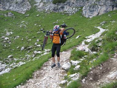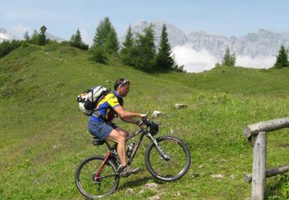 21.7.09, Male – Lago di Tovel, 47,56 km, 1740 hm auf, 1288 hm ab, 8:29 min Die erste Herausforderung des Tages hatte sich schon am Vorabend abgezeichnet… eine Toilette für 6 Radler ist definitiv zu wenig. Hier war kluges Taktieren angesagt… Wer sich gelegentlich deprimiert aus der Dorf-Disco schleicht, weil er sich angesichts des jungen Gemüses dort ziemlich alt vorkommt (O-Ton: Jetzt kommen die Alten schon zum Sterben auf die Tanzfläche…), findet im Frühstückssaal des Hotels Henriette die ideale Therapie. Der Altersschnitt dort dürfte gut dreistellig sein, und so fühlt man sich auch in gesetzterem Alter plötzlich wieder jugendlich. Es ist eben alles relativ, auch das Alter… Frühstück an sich war ok. Gestärkt rollten wir auf dem Radweg Richtung Dimaro und von dort auf einem ausgewiesenen Radweg Richtung Madonna di Campiglio. Die Strecke ist Teil des neu veröffentlichten Brenta-Bikereviers und führt bergan durch schmucke Wälder und entlang tiefer Schluchten. Kurz nach der Malga C.C.Magno zweigt der Radweg zum Rifugio Graffer links ab. Der Anstieg startet recht sanft, wird aber allmählich immer steiler, sodass wir anständig ins Schwitzen kamen und zwei- oder dreimal absteigen mussten. Nur Seppl hatte letzte Nacht offensichtlich zu nahe an der Steckdose gepennt und hat die ganze Strecke hoch gekeult. Im Rifugio Graffer erholten wir uns etwas und gönnten uns ein paar Nudeln für die letzten 200 hm zum Passo del Groste. Gunther schüttete noch ein paar Hektoliter Apfelschorle in sich rein und weiter ging's zum Passo, welcher dann auch schnell erreicht war. Der Ausblick über die Brenta ist von dort wirklich seht beeindruckend.