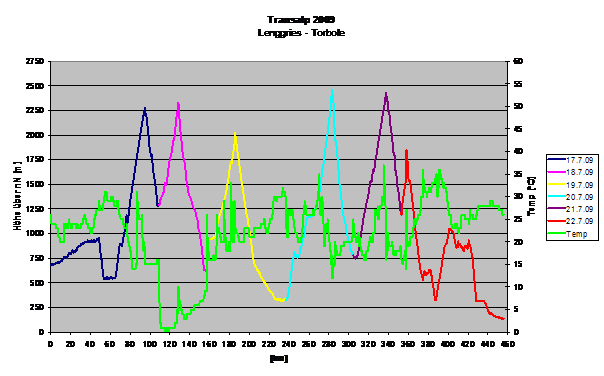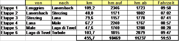 Transalp 2009 17.07.-22.07.2009 Lenggries nach Torbole 456 km, 10469 hm, 6 Etappen Nachdem ich letztes Jahr wegen Haus-Kauf / Renovierung / Umbau transalpmäßig zum Pausieren gezwungen war, ging's dieses Jahr wieder per Fahrrad über die Alpen. Schon recht früh haben wir mit der Planung begonnen und sogar einen für alle passenden Termin gefunden. Die Truppe war diesmal 6 Mann stark. Dabei waren die üblichen Verdächtigen Gunther, Jürgen (Gonzo), Andreas und ich. Auch Seppl war wieder dabei. Als Rookie ging diesmal Oliver an den Start. Dirk konnte leider wegen Babypause und Nachwehen einer Antibiotikum–Behandlung nicht dabei sein. Nach langem Hin und Her haben wir uns für eine Tour aus dem Buch von Achim Zahn entschieden. Von Lenggries bis zum Gardasee sollte es gehen, mit den Highlights Schneebergscharte und Eisjöchl. Wegen der eher schlechten Erfahrungen mit dem Spätsommer-Wetter in den Alpen aus den letzten Jahren haben wir uns diesmal dazu entschlossen, etwas früher zu starten, um Schnee und Eis aus dem Weg zu gehen. Mit eher mäßigem Erfolg, wie man weiter unten im Text lesen kann.
