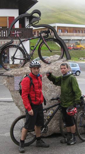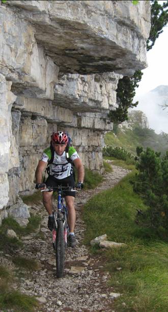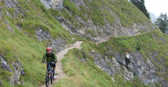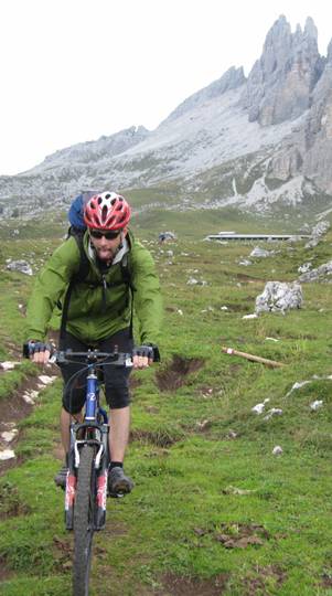 Frühstück war ausgezeichnet und freundlicherweise durften wir Gonzo's Auto für die ganze Woche an der Unterkunft stehen lassen. Alle drei Räder wurden in mein Auto geladen, überschüssiger Ballast in Gonzo's Auto gepackt. Seppl quetschte sich irgendwie zwischen die Fahrräder und los ging's nach Cortina, wo wir schnell einen geeigneten Parkplatz fanden. Also Ausladen und Aufsatteln, wobei ich gleich feststellte, dass ich clevererweise meine Radhandschuhe in Gonzo's Auto in Welsberg liegen hatte. Der Himmel war bedeckt, die Temperaturen noch recht kühl, aber es war trocken. Das Navi führte uns recht schnell zum eigentlichen Startpunkt. Von dort ging's auf Asphalt mit moderater Steigung zur Malga Fedara. Das tolle Panorama über Cortina und die Tofana haben wir zu diesem Zeitpunkt noch nicht wirklich zu würdigen gewusst, da wir noch nicht ahnten, dass von Panorama wetterbedingt die nächsten beiden Tage nicht viel zu sehen sein sollte. Im Rifugio Lago di Croda gab's erst mal einen Espresso. Die restliche Singletrial-Auffahrt zum Forcella Ambrizolla war schon von der Hütte aus sichtbar und größtenteils fahrbar. Von hier aus geht’s teils über Ski-Abfahrten und schönen Trials hinunter nach Alleghe. Diesen Ort werde ich wohl nie vergessen, weil ich dort am 11. September 2001, dem Tag der World Trade Center Anschläge mit Gunther auf einer Transalp übernachtet habe. Diesmal allerdings ließen wir den Ort quasi links liegen und bogen nach rechts Richtung Sottoguda ab. Unterwegs gönnten wir und bei "Da Tobia" noch ein Kiosk-Radler und so ging's die letzten paar Kilometer und Höhenmeter zum Tagesziel recht flott voran. Mittlerweile hatte es angefangen etwas zu regnen und der Himmel verdunkelte sich zusehends. In Sottoguda angekommen, steuerten wir sofort das erste Hotel an. Ein Zimmer war noch frei und erschwinglich, aber die Empfangsdame war sehr unfreundlich, worauf wir beschlossen, etwas anderes zu suchen. Im Hotel Montanara wurden wir dann auch fündig. Kaum angekommen, hat es dann auch wirklich heftig angefangen zu regnen. Fünf Euro extra war es uns wert, Gonzo wegen seiner Schnarcherei in Einzelhaft zu verbannen. Duschen und Klamottenwaschen, das übliche Prozedere eben, war zuerst angesagt. Bevor das Halbpension-Essen gereicht wurde, hat Seppl noch die Sauna aufheizen lassen. Essen, Rotwein und Bedienung waren schlicht "perfetto", nur das abschließende Schnäpschen in der Hotelbar musste mangels Servicepersonal ausfallen.
