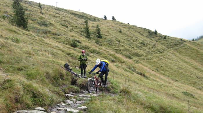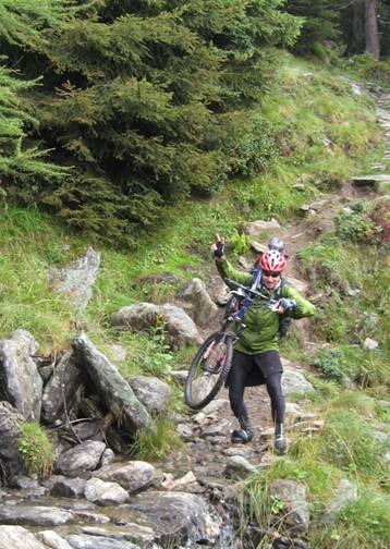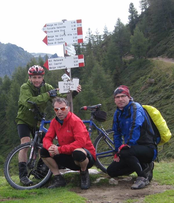 06.09.11, 3. Etappe, Paneveggio – Valle del Vanoi In der Nacht schüttete es apokalyptisch, aber beim morgendlichen Wettercheck hatte der Regen etwas nachgelassen. Frühstück war gut und die Schuhe fast trocken. Noch ein paar Tropfen Öl auf die geplagte Ketten und los ging's auf der Straße zum Passo Rolle. Die Auffahrt ging recht fix und der Verkehr war wegen des bescheidenen Wetters auch überschaubar. Außer italienischen Pilzsuchern und ein paar bekloppten Touristen war so früh morgens nicht viel los und der Pass war schnell erreicht. Kurz nach dem Pass biegt der Trial rechts von der Straße ab. Der zunächst fast unsichtbare Trial war wegen des nächtlichen Regens sehr tief. Zudem schienen die örtlichen Rindviecher allesamt unter Dünnschiss zu leiden, jedenfalls war der Trial komplett zugepflastert mit Kuhfladen. Beim Überqueren eines stromführenden Weidezauns hat sich Seppl noch einen deftigen Stromschlag abgeholt, uns so haben wir beschlossen, uns nicht weiter durch den Cocktail aus Kuhfladen und Matsch zu quälen, sondern die parallel verlaufende Straße hinunter nach San Martino zu nehmen.