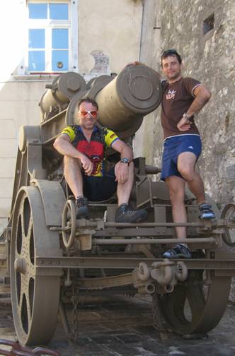 09.09.11, 6. Etappe, Rifugio Lancia – Rovereto Heute ging’s nur noch bergab. Nach brauchbarem Hüttenfrühstück schwangen wir uns auf unsere Fahrräder und rollten auf zunächst geschotterter, später asphaltierter Fahrstraße stetig bergab Richtung Rovereto. Einziger nennenswerter Stopp war eine kurze Photosession an einem an den Fels gemauerten Kloster kurz vor Rovereto. Am Bahnhof in Rovereto angekommen riefen wir zunächst Gonzo an. Der war auch erreichbar und erschien binnen weniger Minuten am Bahnhof, wo wir zwischenzeitlich unsere Bargeldreserven wieder aufgefüllt hatten. Gonzo war schon am Vortag in Rovereto angekommen und hatte die Stadt erkundet. Als quasi Eingeborener erteilte er uns eine kurze Stadtführung per Fahrrad, inklusive Espresso in einem Straßenkaffee. Den kulinarischen Abschluss sollte ein kleines Essen bilden, allerdings fanden wir nur eine Straßen-Pizzeria. Dazu servierte der Köbes eine Maß zu gesalzenem Oktoberfestpreis.