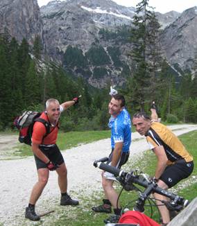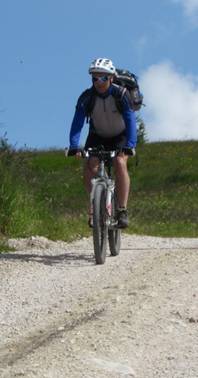 Zunächst auf der Hauptstraße fuhren wir hinunter Richtung Canazei, bogen aber an der Liftstation am Hotel Lupo Bianco rechts ab auf einen Wirtschaftsweg bergauf zum Sella-Joch. Der anfangs noch harmlose Weg wurde immer steiler und so mussten wir teilweise schieben.