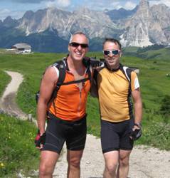 Der Trubel auf dem Sella-Joch war noch extremer als auf dem Pordoi, deshalb verweilten wir dort nur kurz. Die Abfahrt nach St Ulrich war allerdings super. Auf einer ausgeschilderten Abfahrtsstrecke über Skipisten und Singletrials brezelten wir bei tollem Wetter fast ohne Pause ins Tal. Diesmal klappte verblüffenderweise die Handy-Kommunikation mit Patrick, der mit Seppl schon angekommen war und auch eine Unterkunft gefunden hatte. Seppl war nochmal zu einer Abendrunde aufgebrochen und Patrick entspannte sich im Liegestuhl in der Sonne vor dem Haus. Auch wir gönnten uns dort ein Kaltgetränk und nicht viel später traf auch Seppl ein.